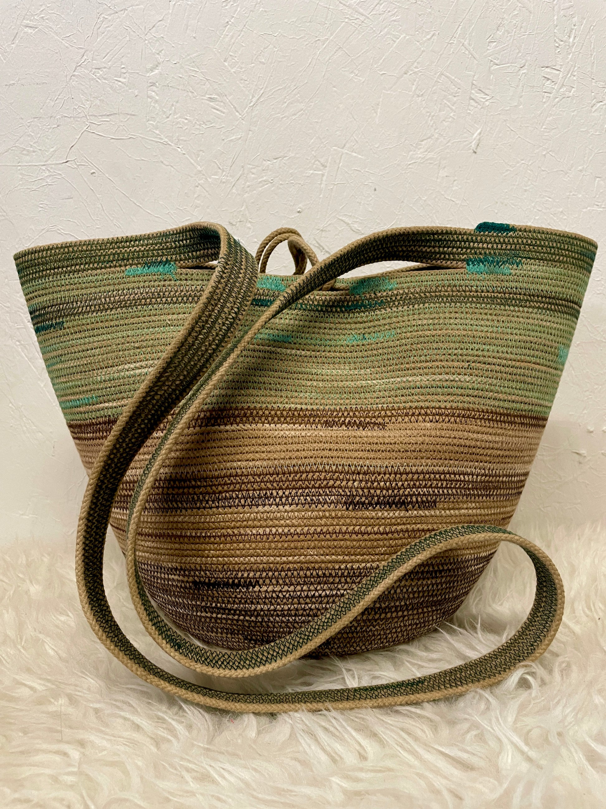 Our Foraging Basket is our most versatile design. This ONE-OF-A-KIND basket features shades of teals and turquoises with a neutral base.