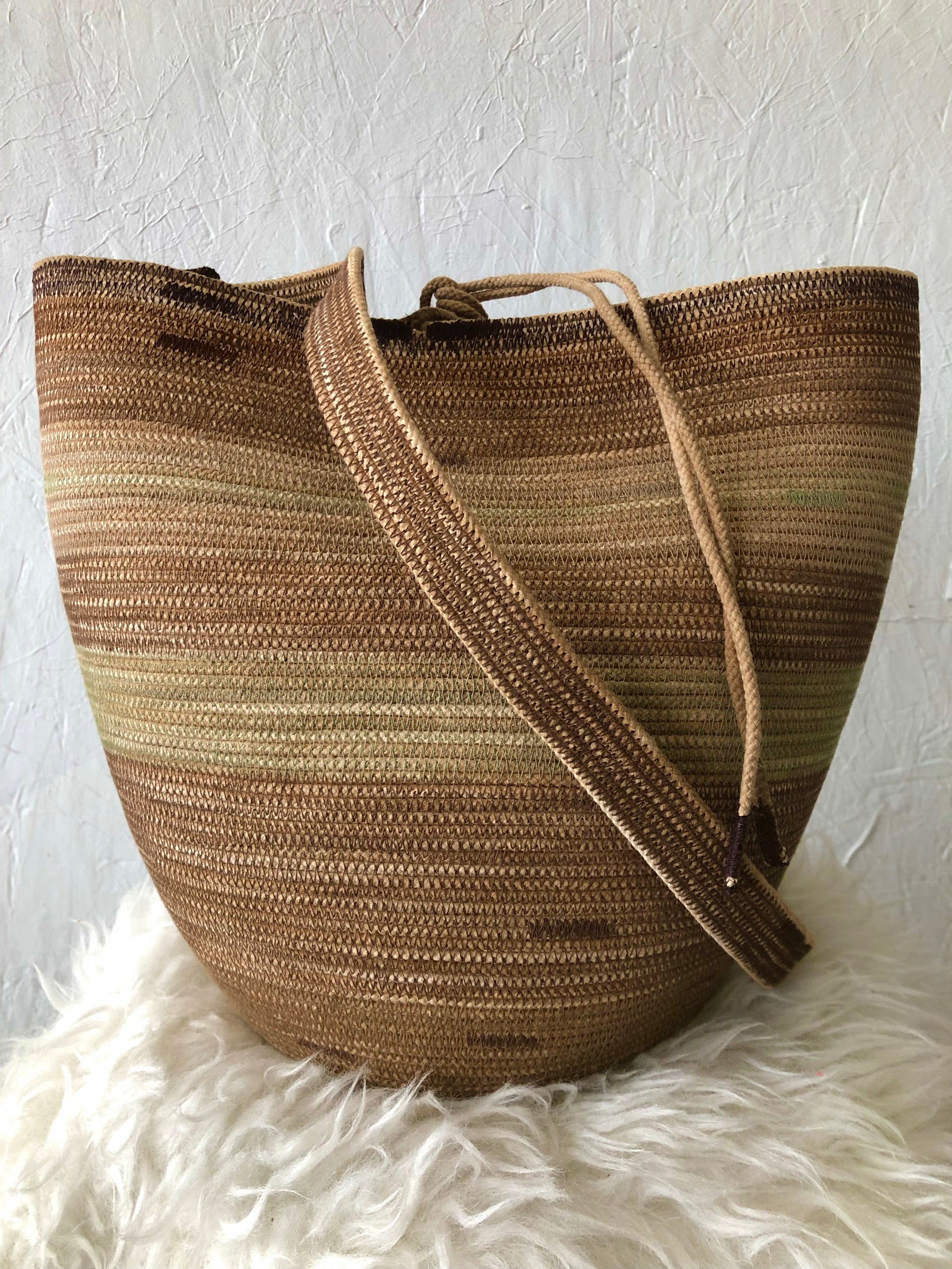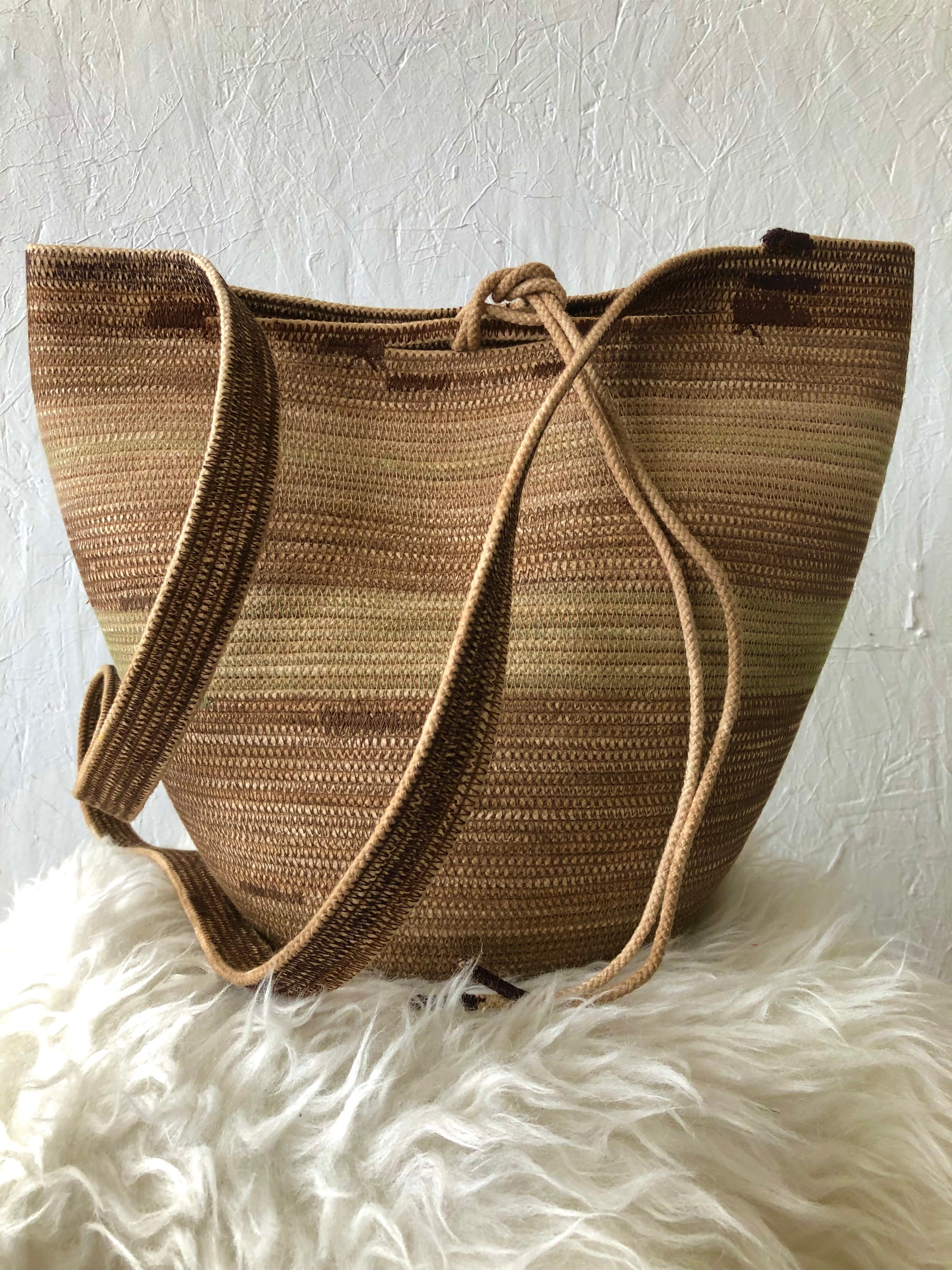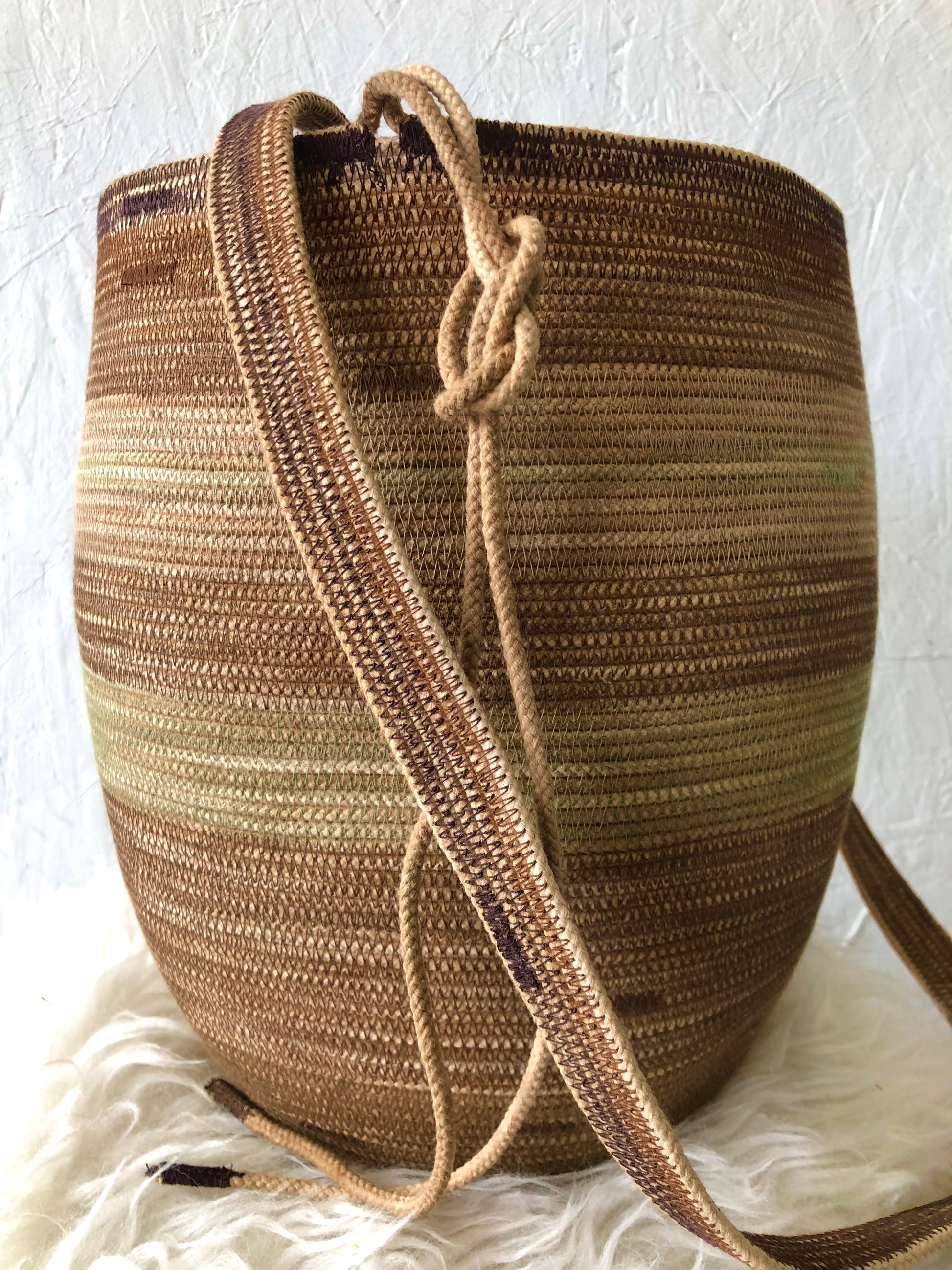 Depending on how you tie down the main strap you can wear it across the body, over the shoulder, carried as a regular basket or on your back like a backpack. Each basket is one-of-a-kind and will keep its shape with wear.