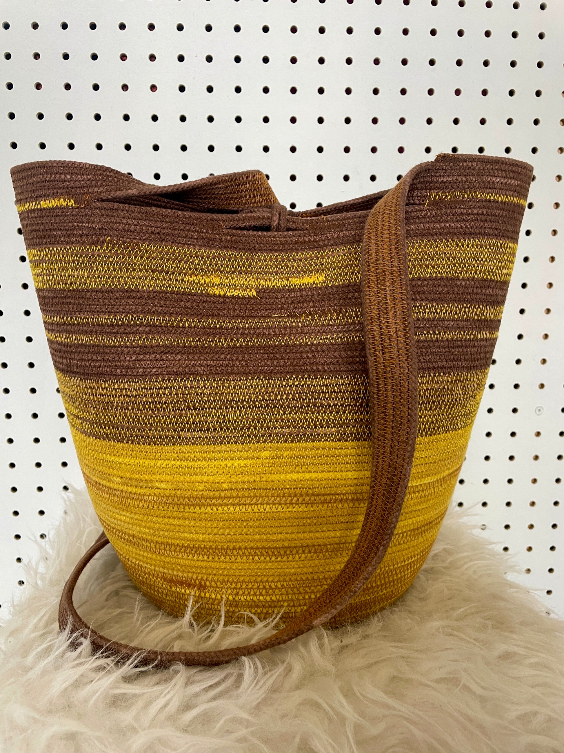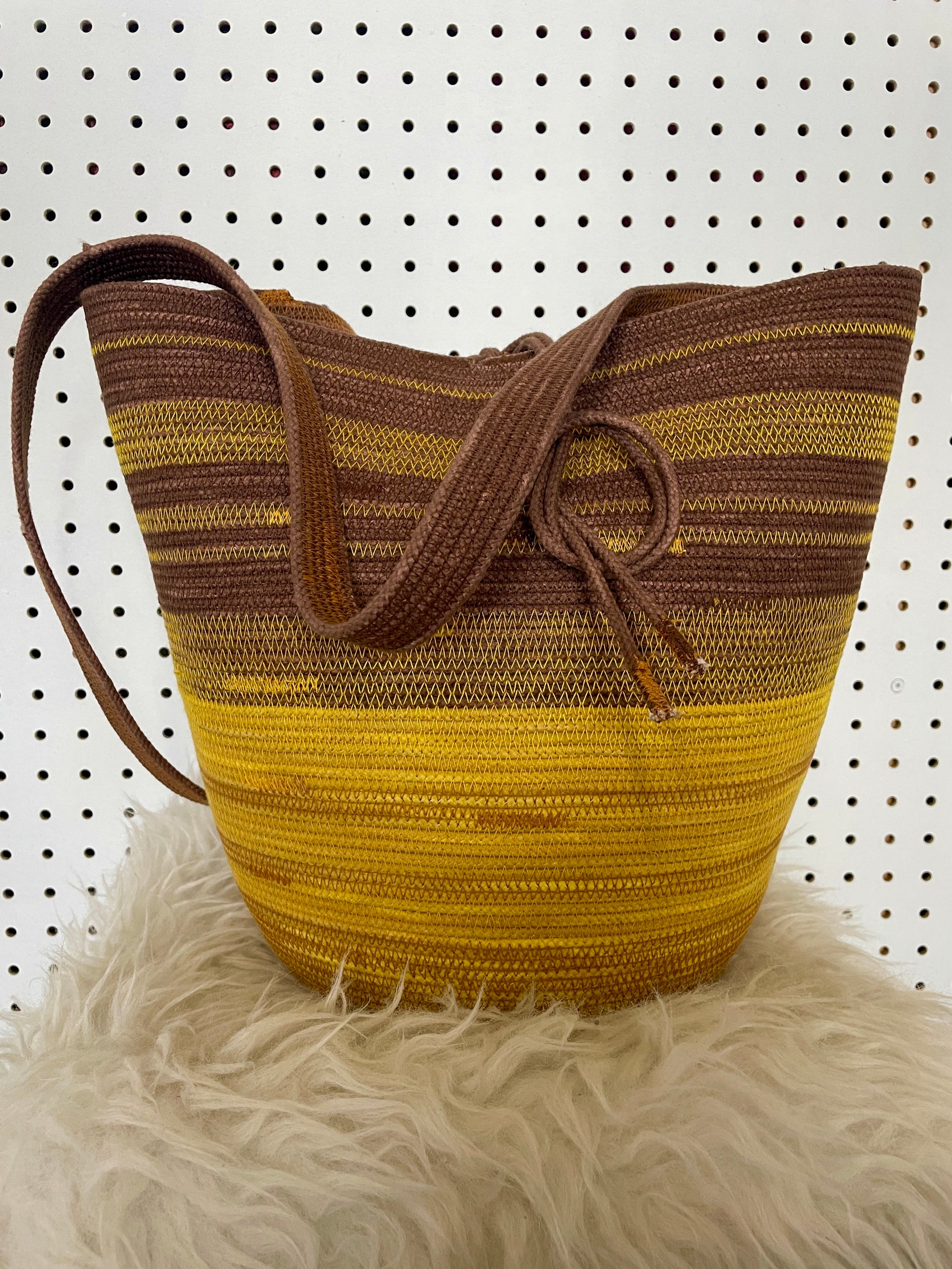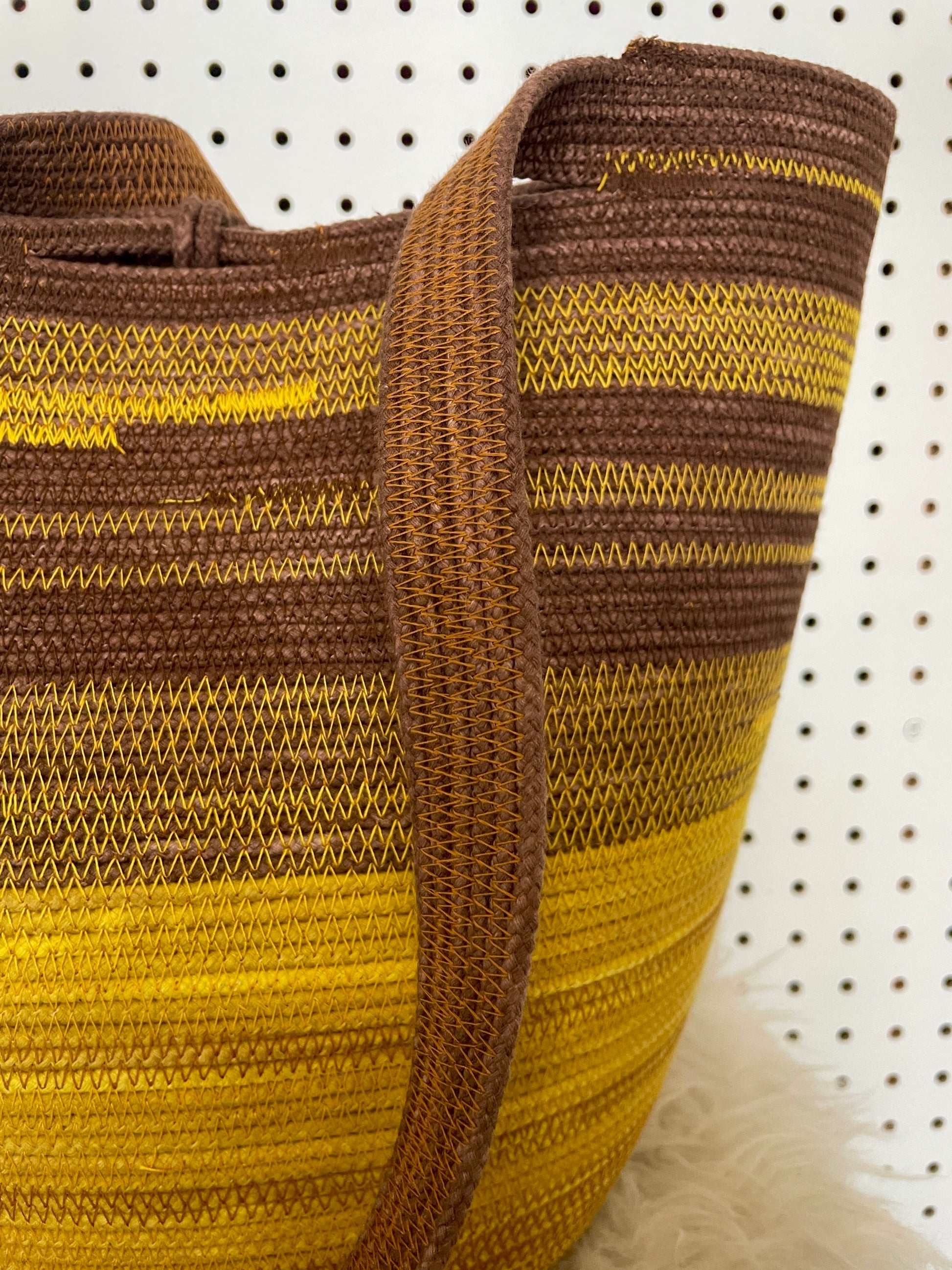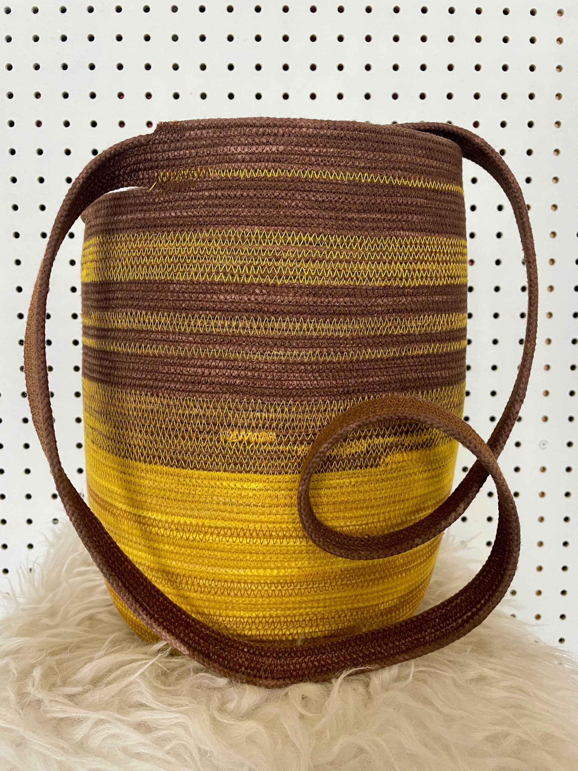 Our Foraging Basket is our most versatile design. A ONE-OF-A-KIND basket in mustards and chocolate browns.
