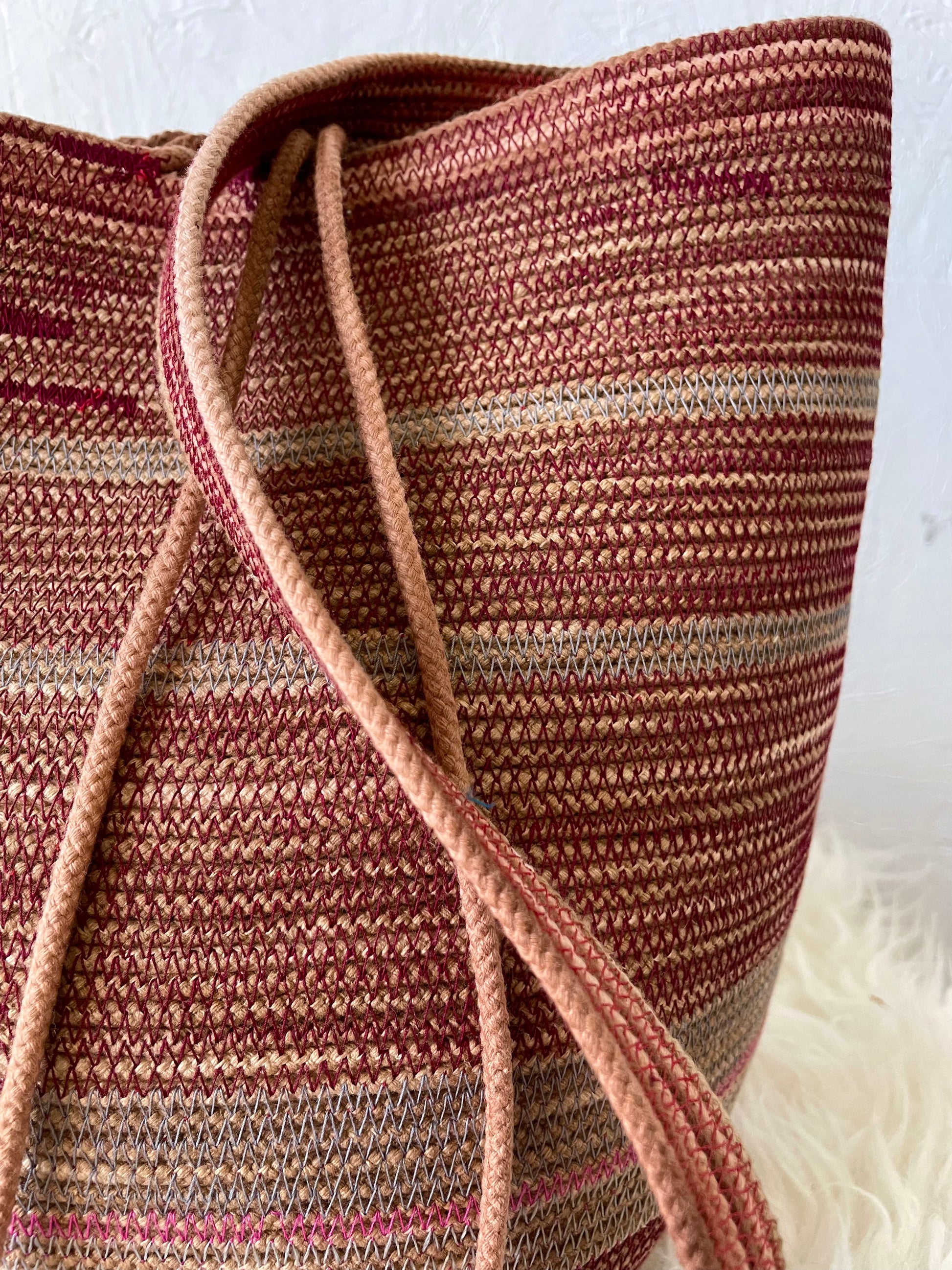 The Foraging Basket is our most versatile design. A ONE-OF-A-KIND basket with accents of soft greys and pink on a base of deep and rich cherry..
