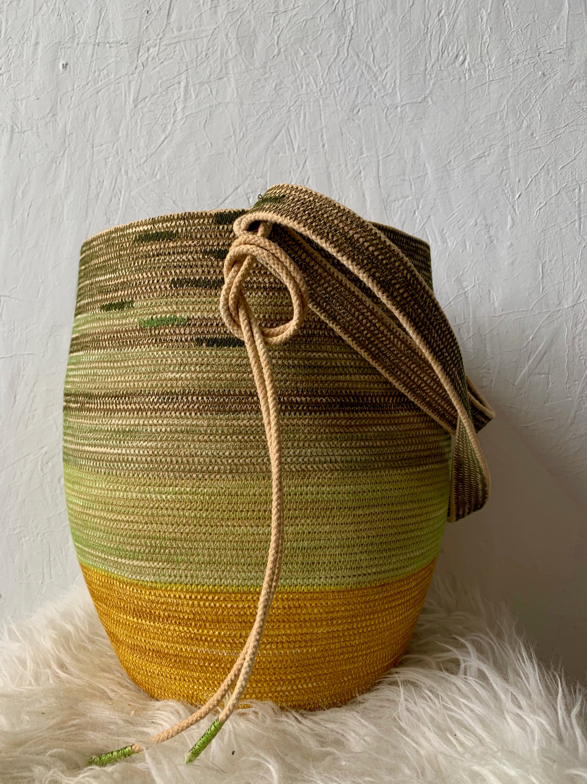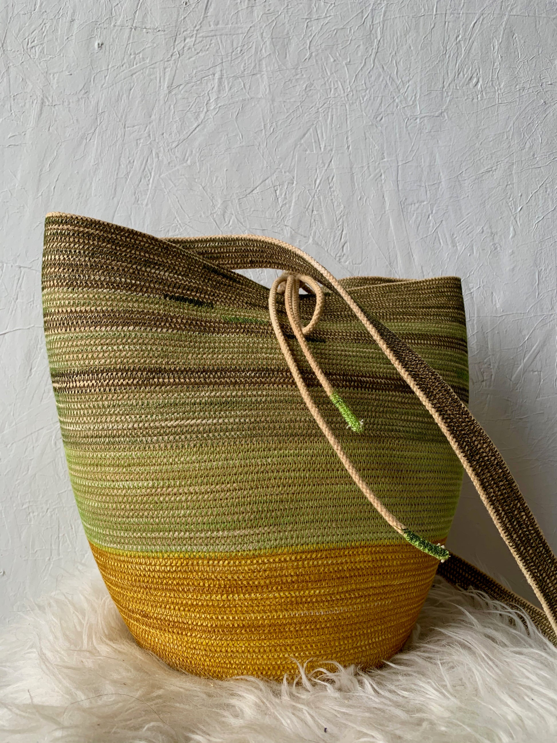 Depending on how you tie down the main strap you can wear it across the body, over the shoulder, carried as a regular basket or on your back like a backpack. Each basket is one-of-a-kind and will keep its shape with wear.