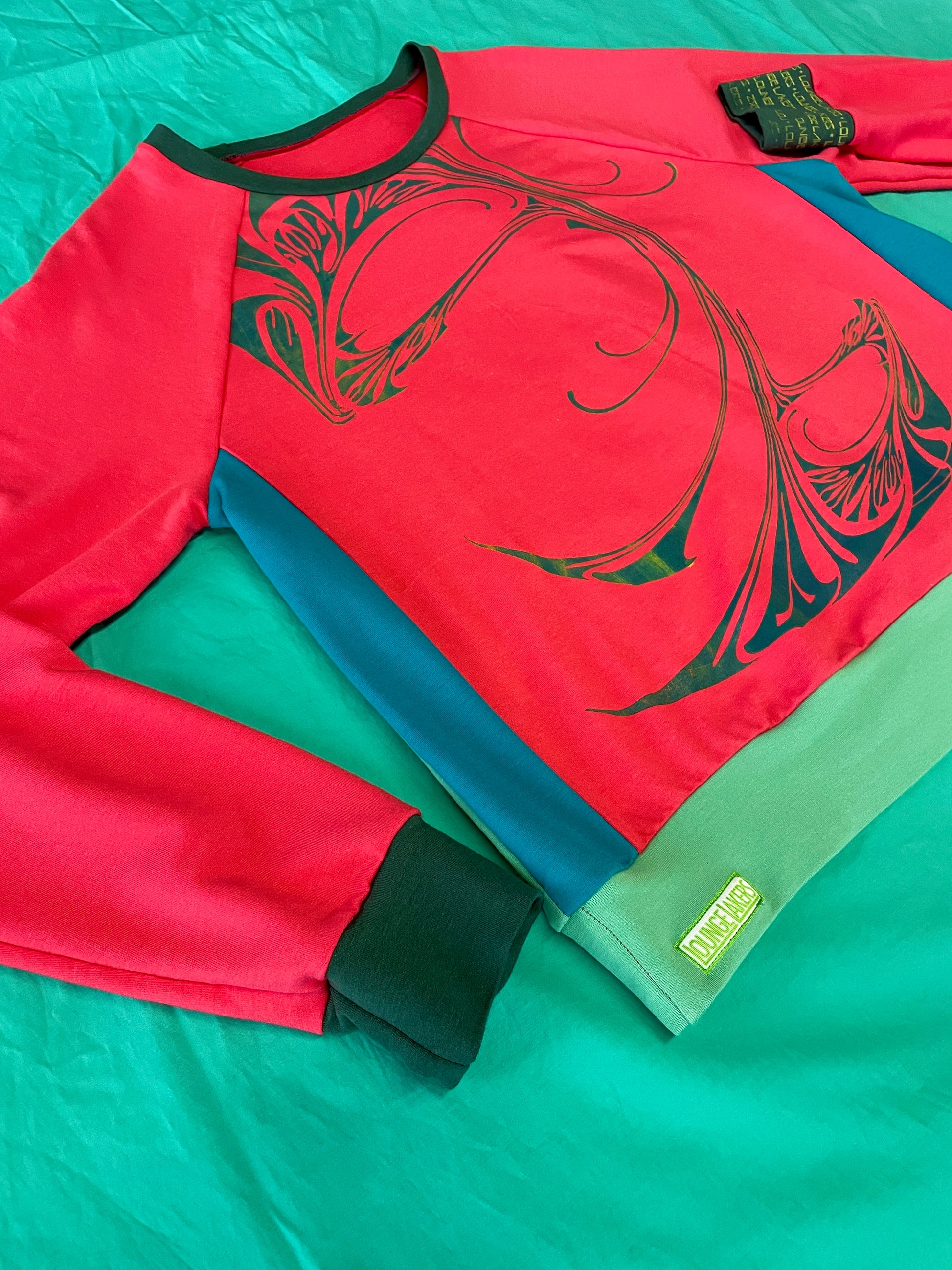 The classic Lounge Lakers unisex pullover sweater with a one-off boat neck collar. A unique piece with art nouveau inspired screen print.