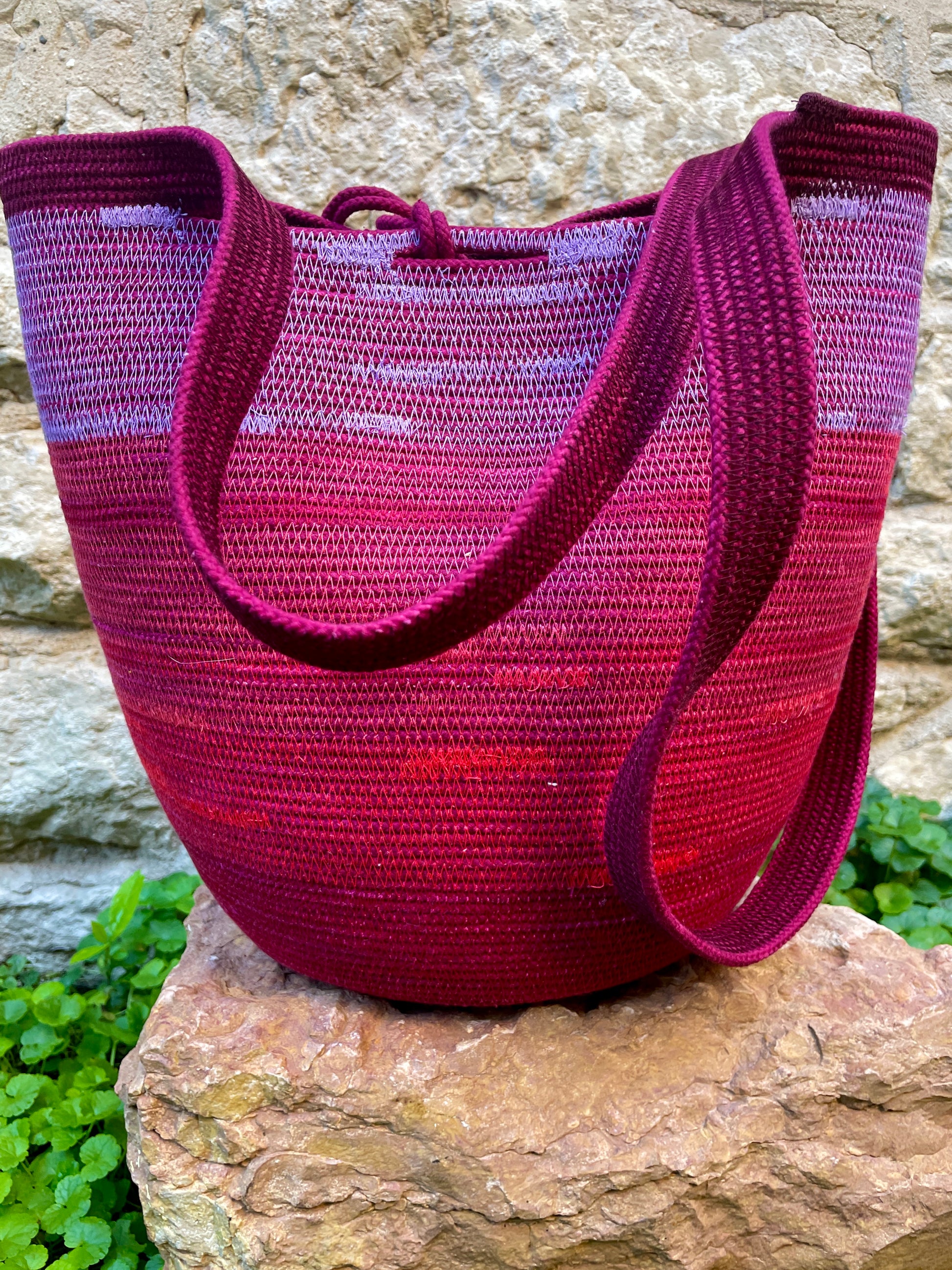 Our Foraging Basket is our most versatile design. A ONE-OF-A-KIND basket in burgundy and coral with a lavender top.