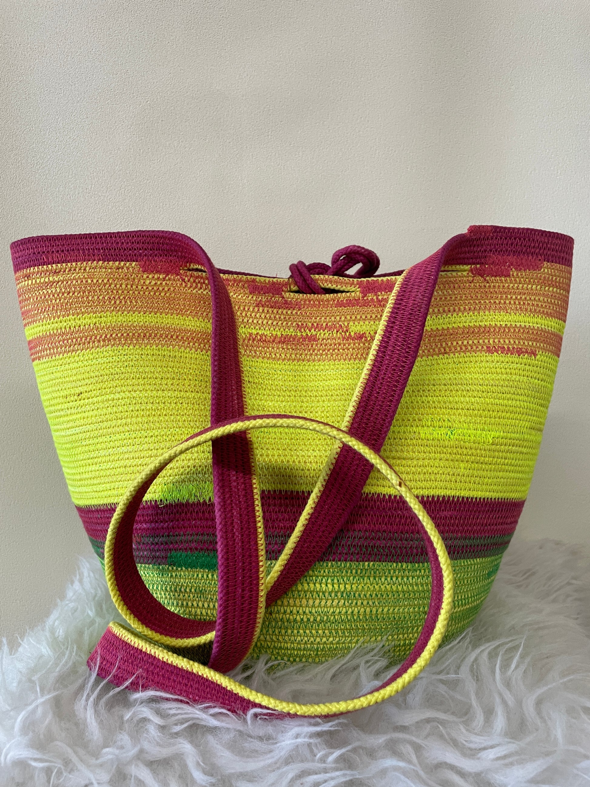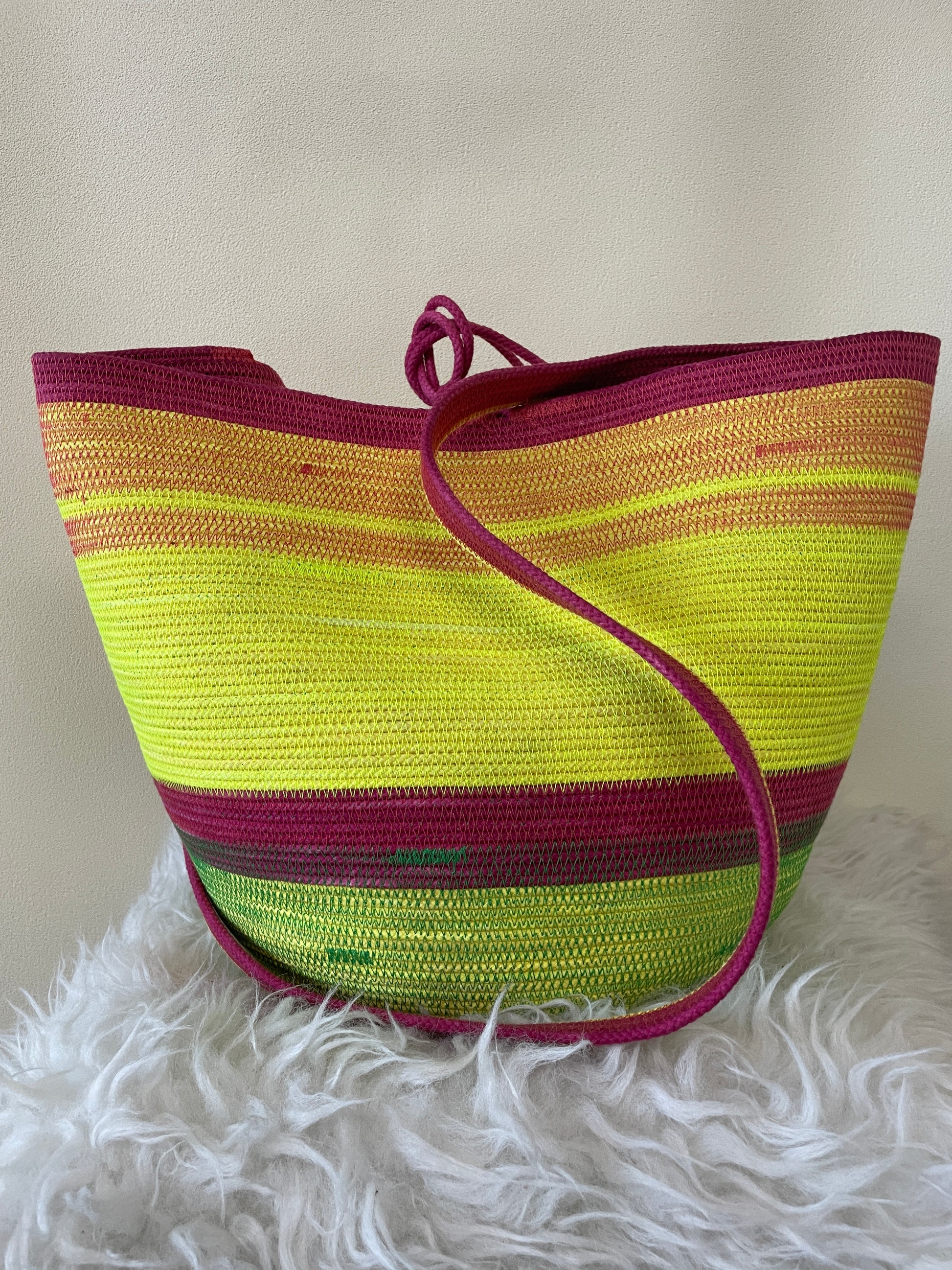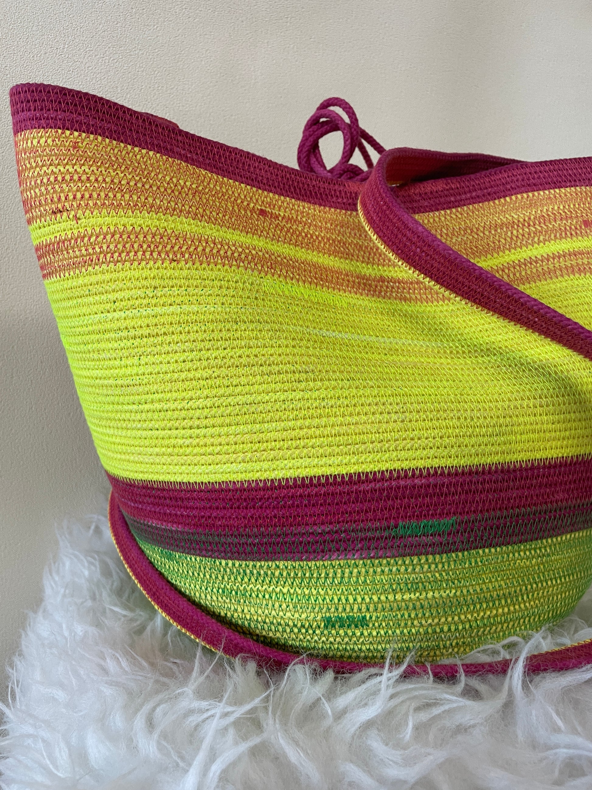 Our Foraging Basket is our most versatile design. A ONE-OF-A-KIND basket in day-glow green with pink accents.