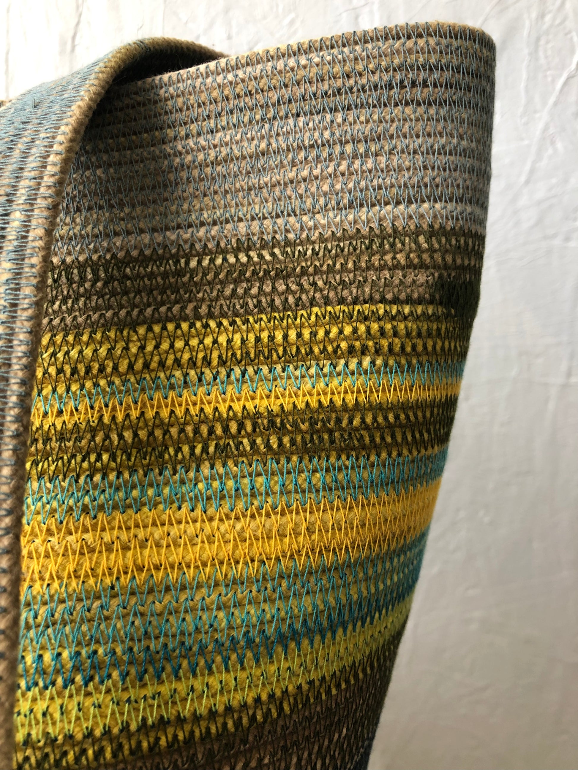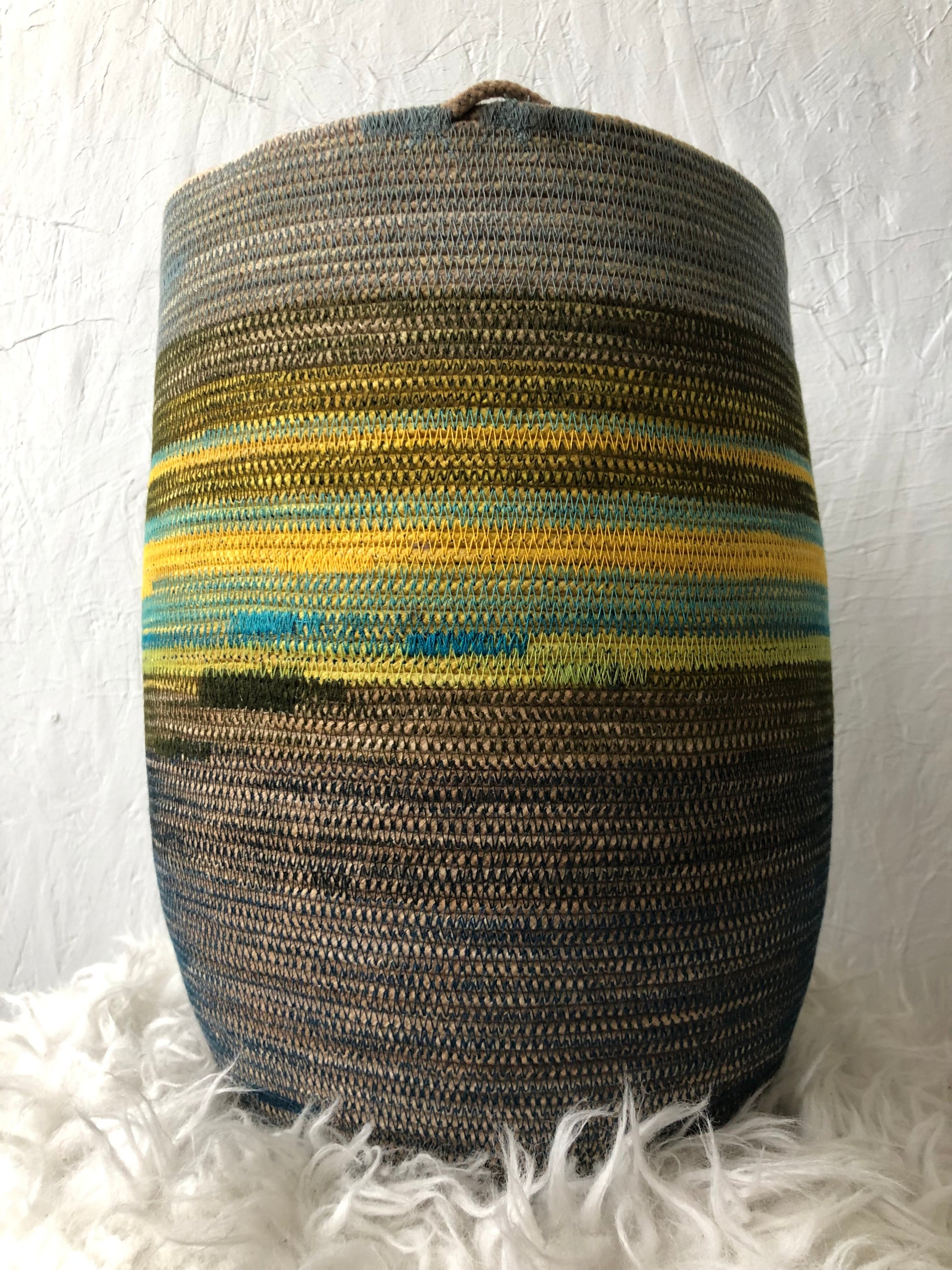 Our Foraging Basket is our most versatile design. A ONE-OF-A-KIND basket with a strong yellow anchored by deep blues and greens.