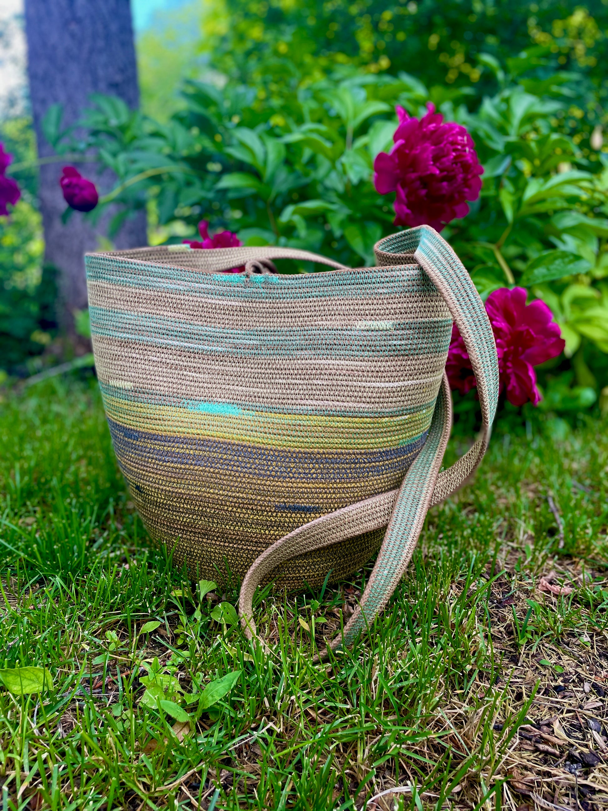 Our Foraging Basket is our most versatile design. This ONE-OF-A-KIND basket features my naturally dyed rope/cord. The base has been dyed with onion skin and turmeric and the top/strap with avocado and coffee.