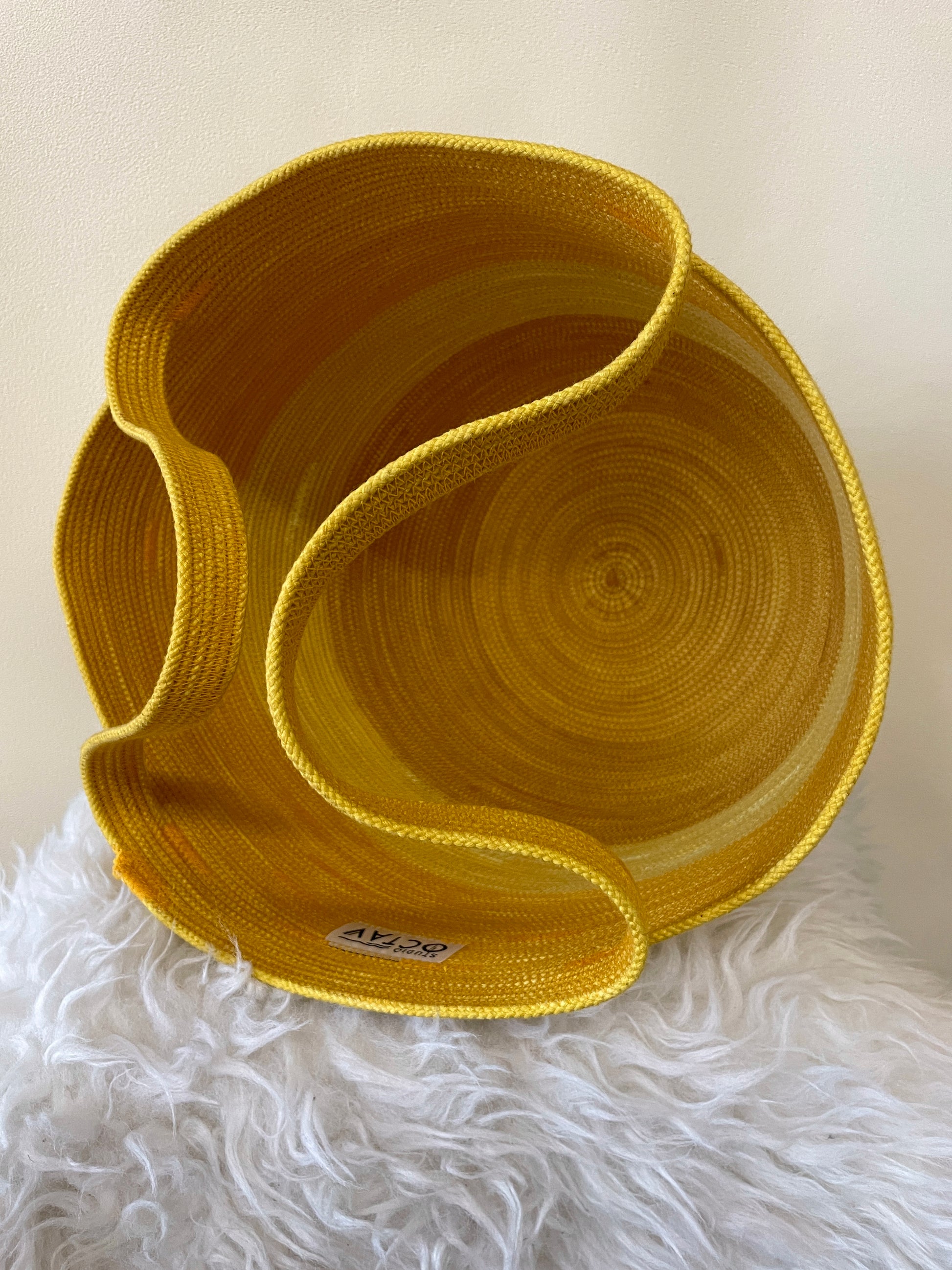 This design is a beautifully functional basket with simple handles that flow from the body of the vessel. This ONE-OF-A-KIND basket displays yellow in all her forms.