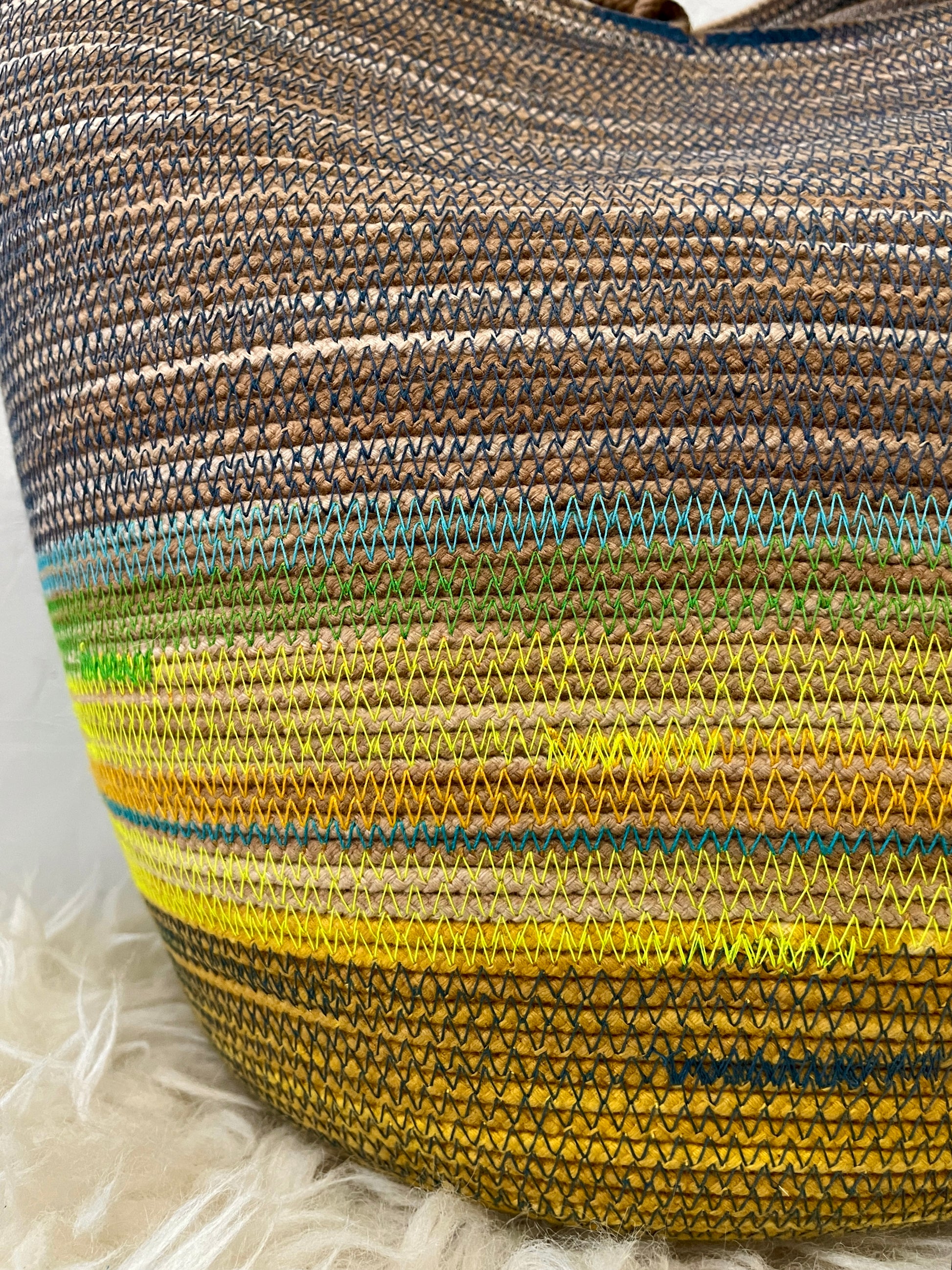 Our Foraging Basket is our most versatile design. This ONE-OF-A-KIND basket features a jewel toned, onion skinned dyed base with a blue hued upper.