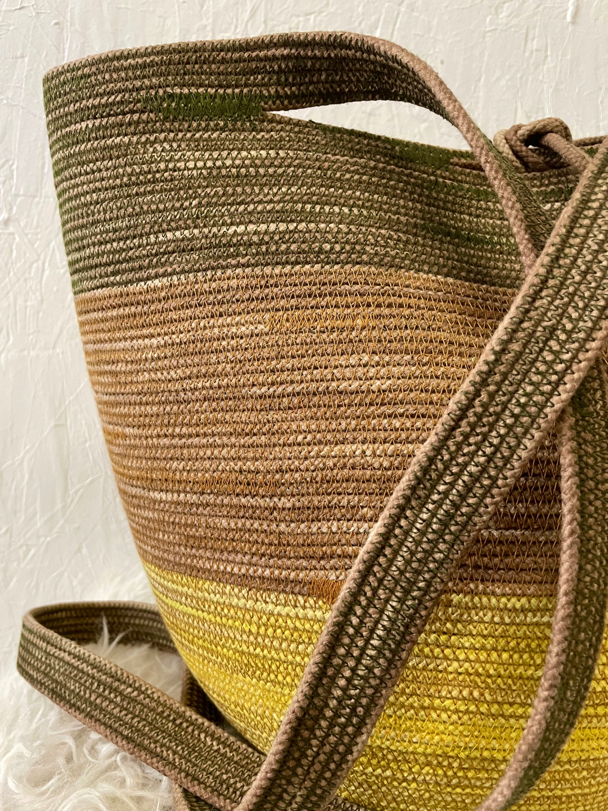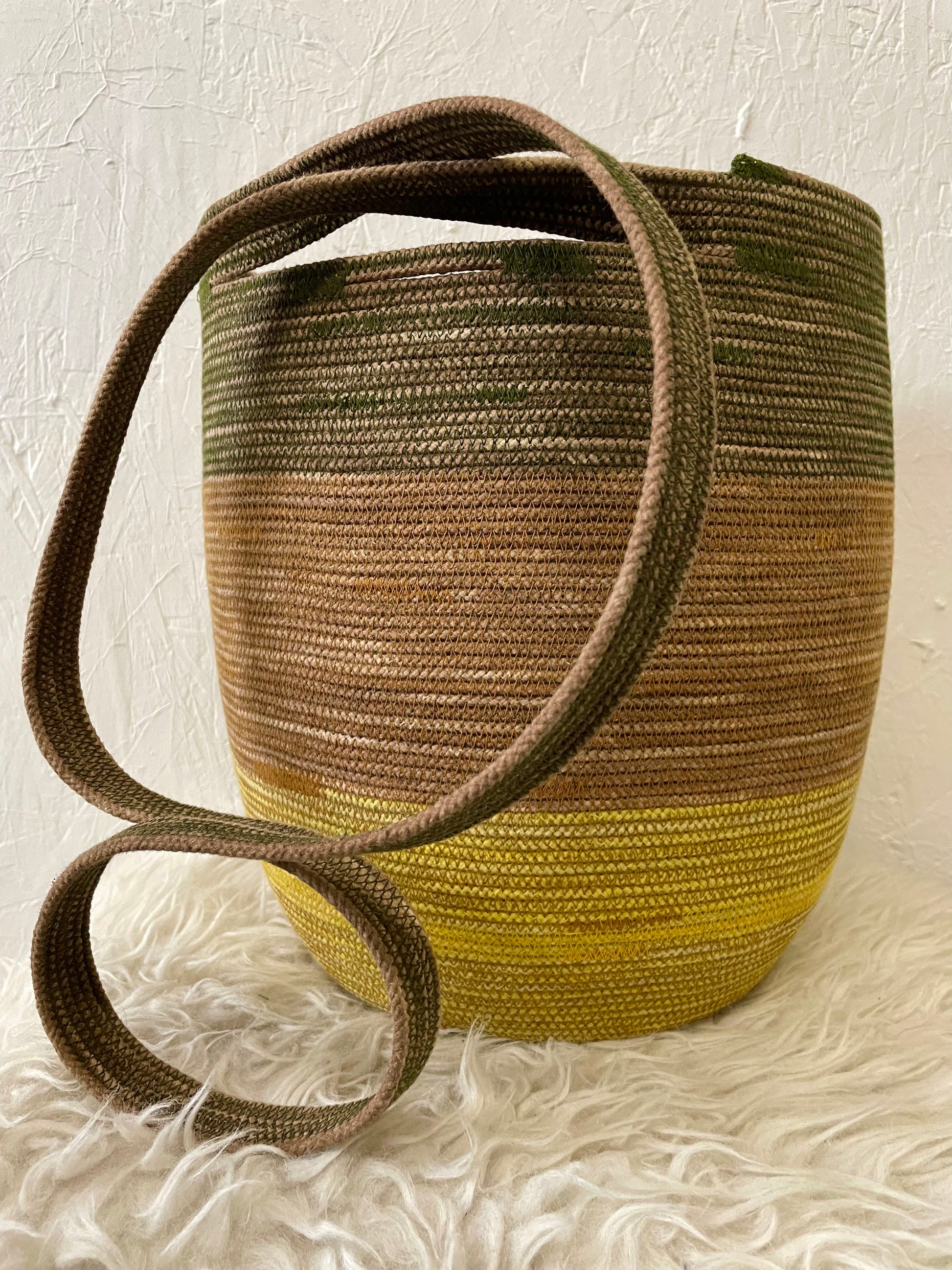 Our Foraging Basket is our most versatile design. This ONE-OF-A-KIND basket features my naturally dyed rope/cord. Dye consists of tumeric/onion skin and fresh indigo leaves from my garden.