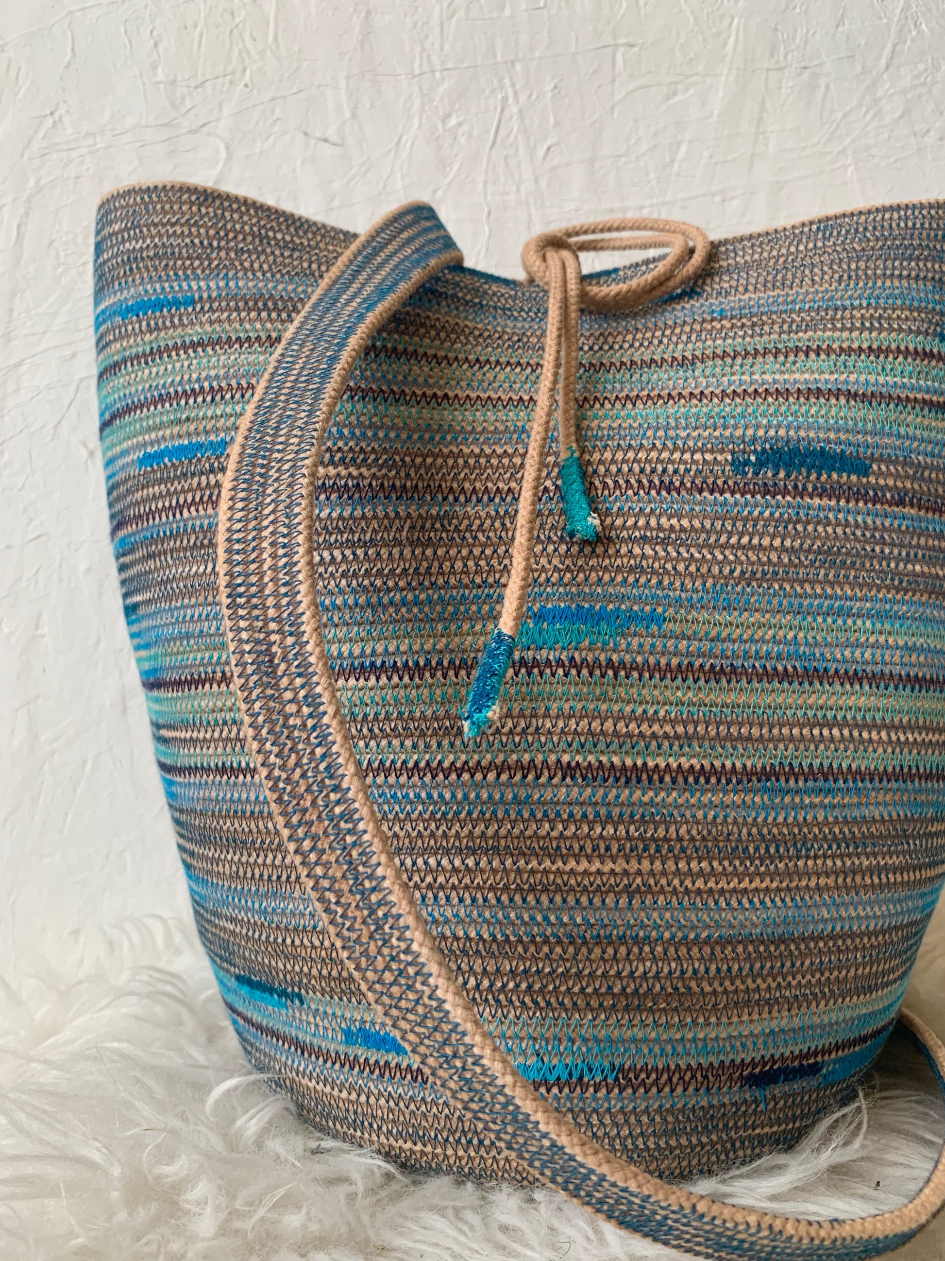 Our Foraging Basket is our most versatile design. This ONE-OF-A-KIND basket in an electric flurry of blues.