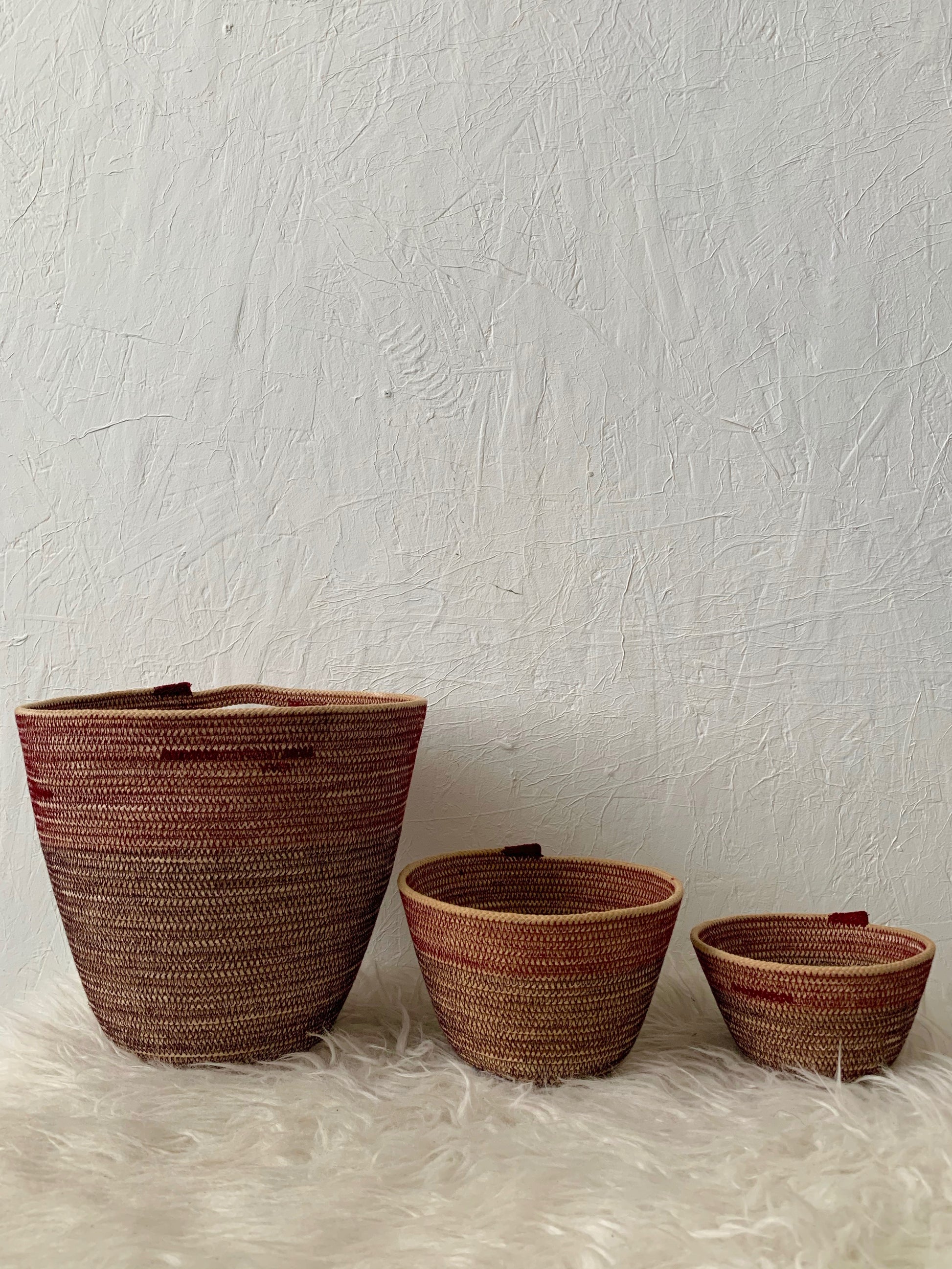 This set of three is sewn with coffee/tea/avocado dyed rope and threads of plum and burgundy.