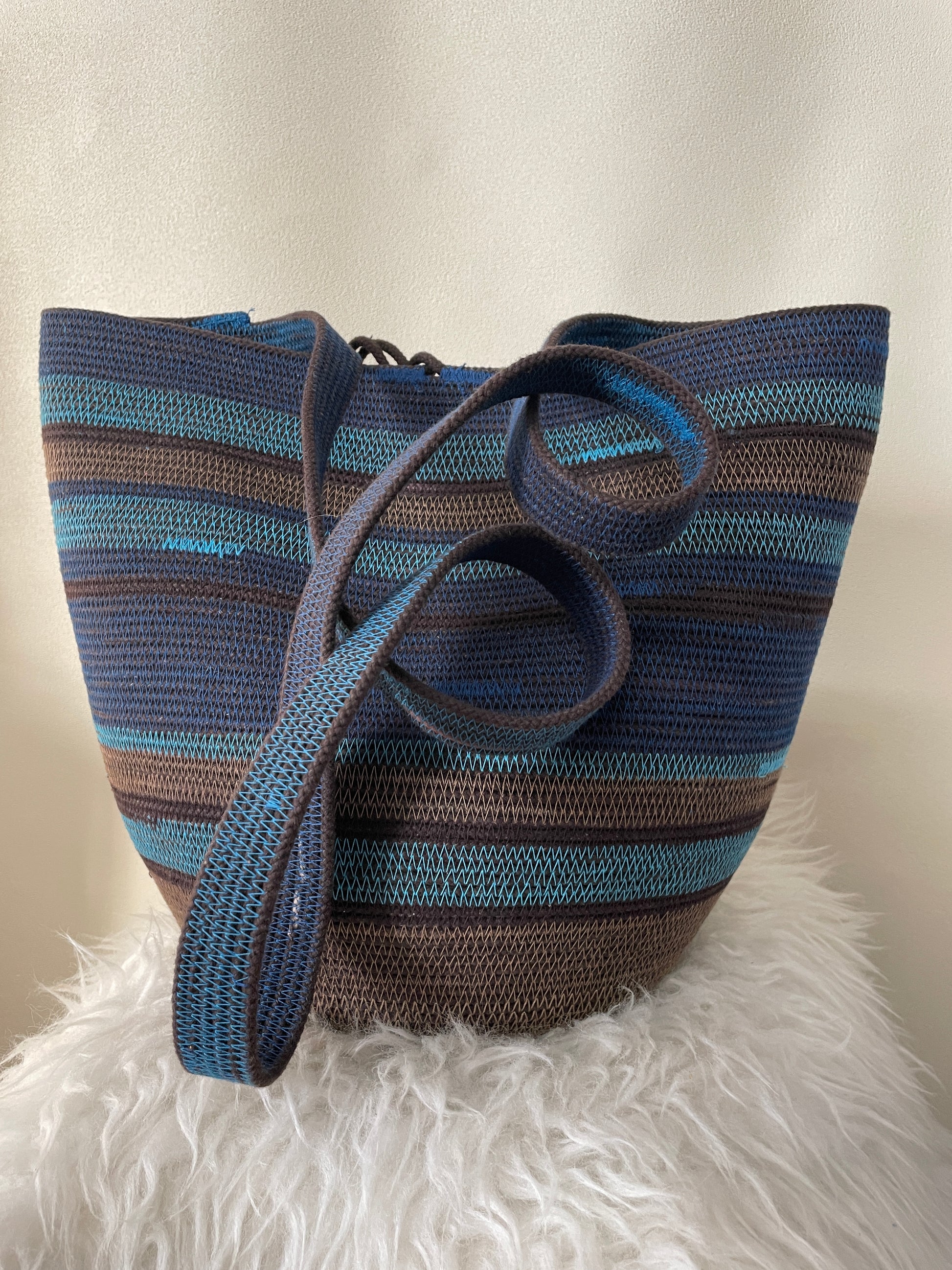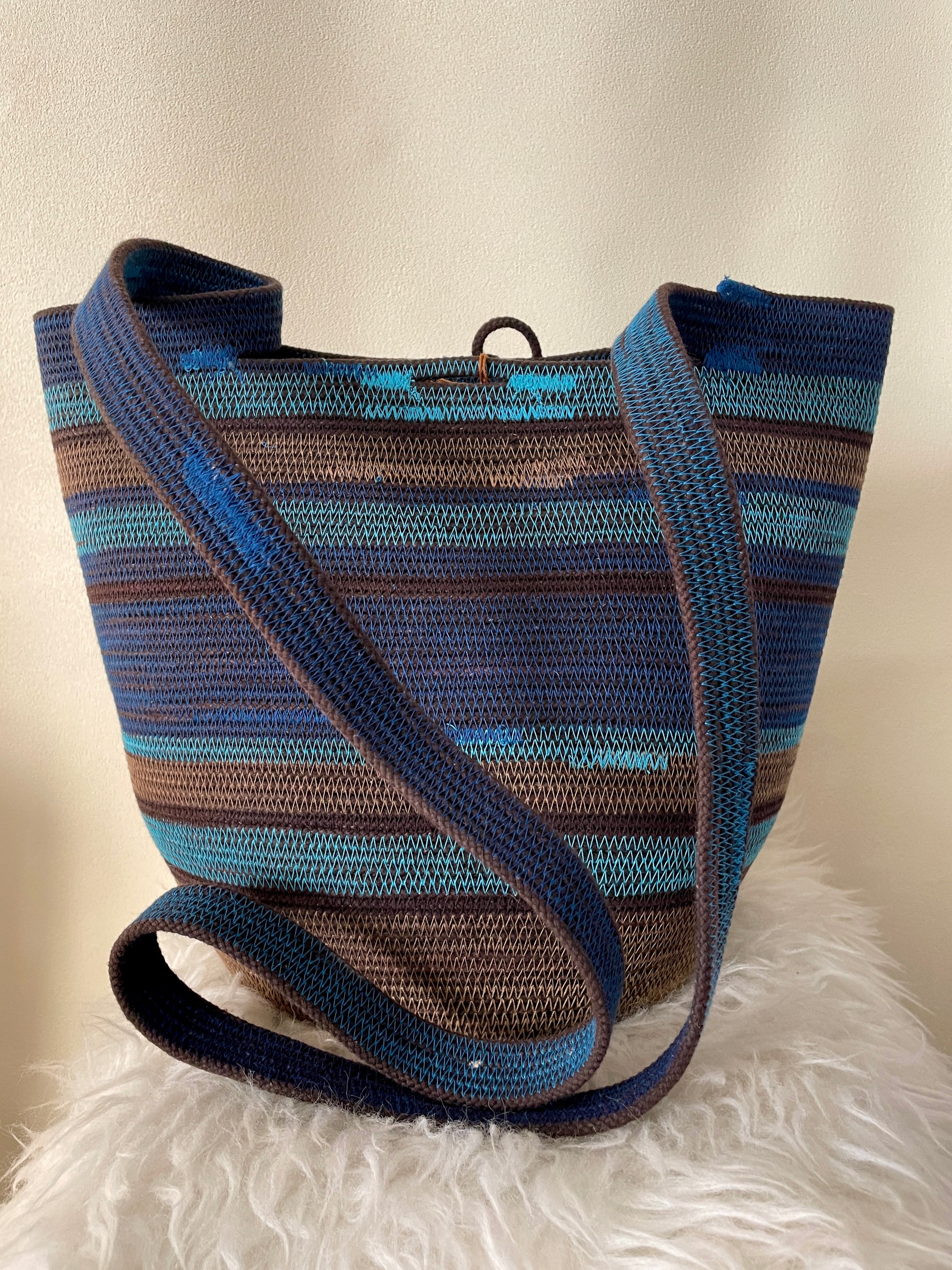 This design can be worn across the body, over the shoulder, carried as a regular basket or on your back like a backpack. Each basket is one-of-a-kind and will keep its shape with wear.